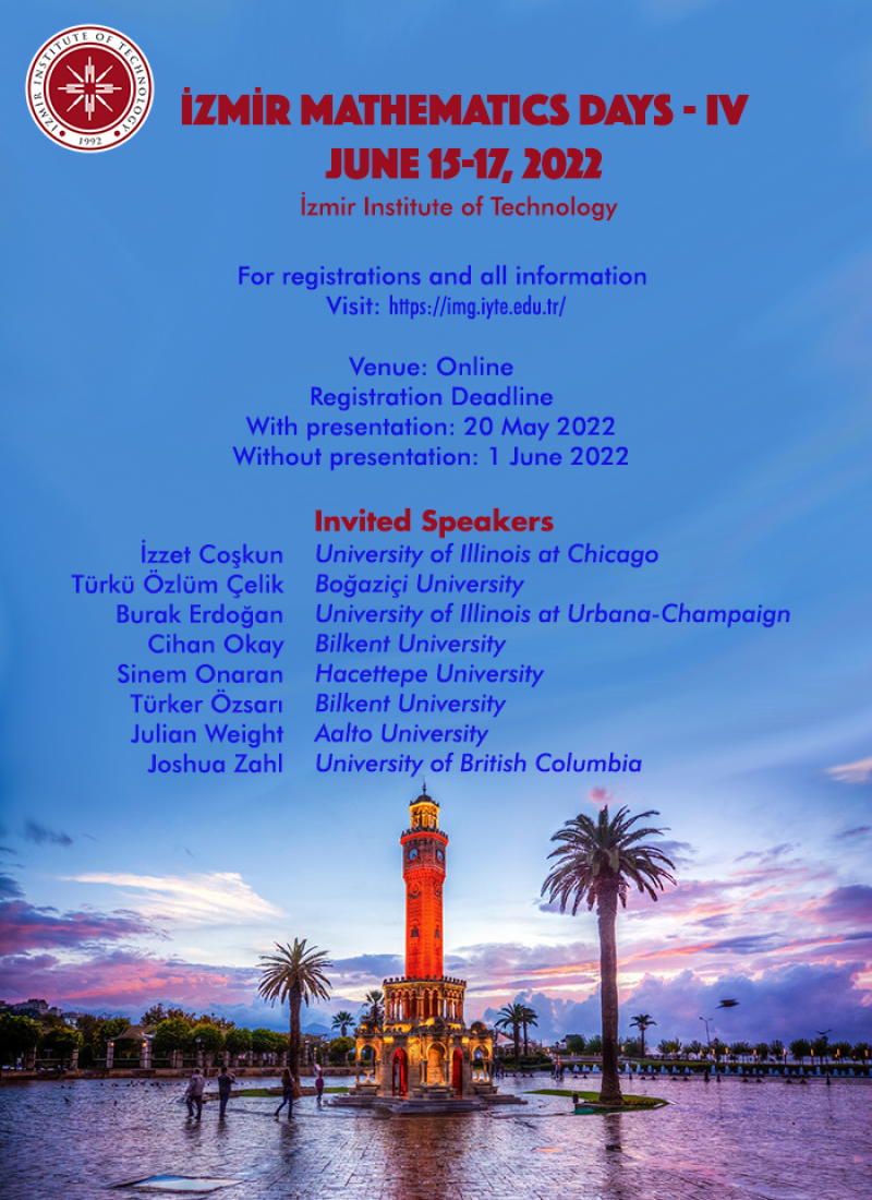 15-17 Haziran 2022 tarihleri arasında çevrimiçi olarak gerçekleştirilecek İzmir Matematik Günleri (İMG-IV) bu yıl İzmir Yüksek Teknoloji Enstitüsü Matematik Bölümü tarafından düzenlenmektedir. Etkinlik ile ilgili detaylı bilgilere https://img.iyte.edu.tr/ sayfasından ulaşabilirsiniz.